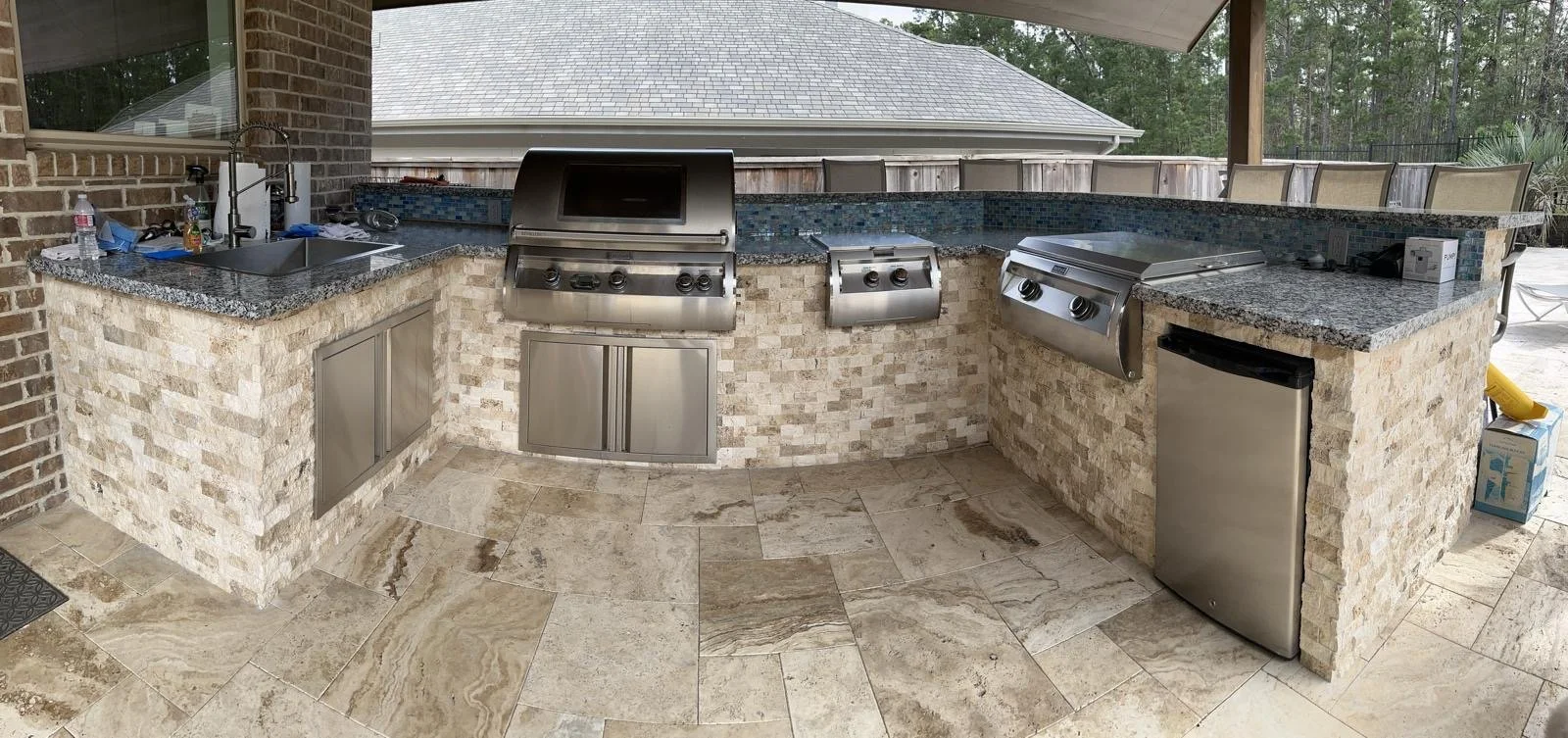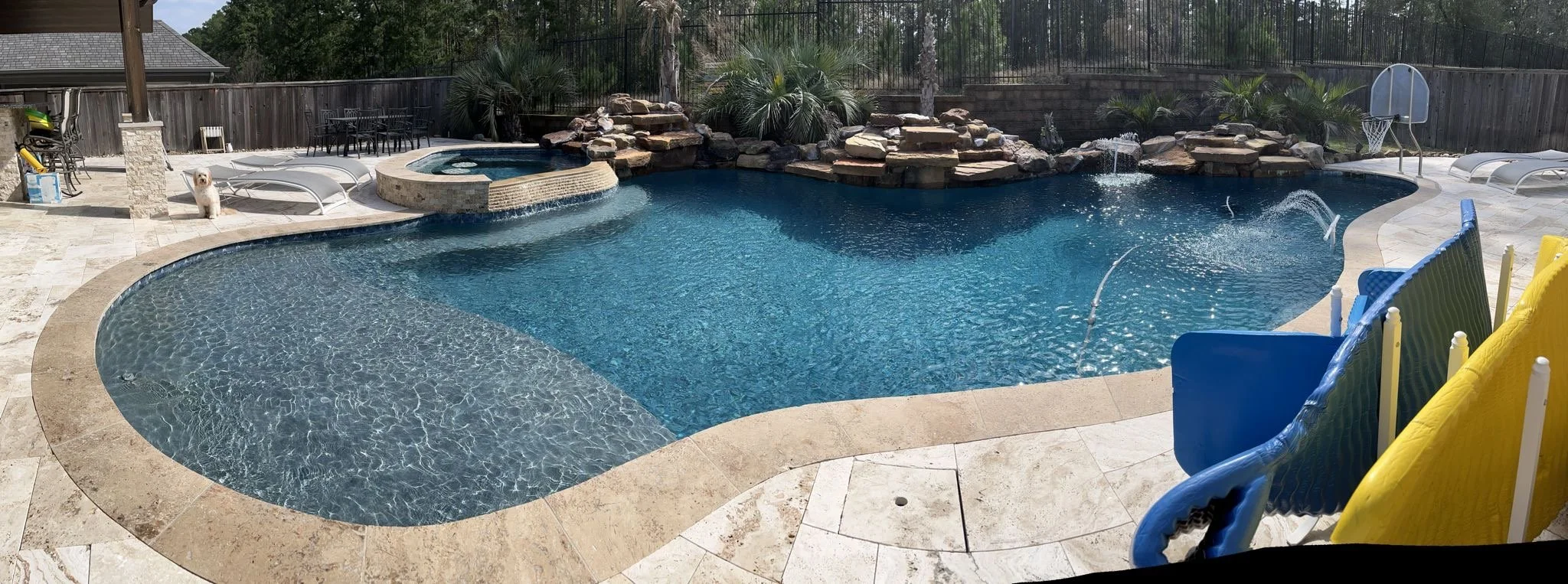 A new pavilion to extend usable outdoor space during the hot Texas summers, an upgraded kitchen to meet the needs of a chef and rethinking the stone flooring around a pool transformed this outdoor space from basic to inviting.